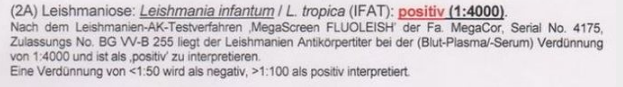 Bei einem positiven Antikörper-Nachweis hat der Hund bereits auf das Eindringen des Parasiten reagiert und gilt als „infiziert“. Wenn der Antikörper-Nachweis positiv ausfällt sollten unbedingt weitere Blutanalysen (grosses Blutbild inkl. Organwerte und EEP) durchgeführt werden. Denn der positive Antikörpernachweis alleine sagt noch nichts über die Schwere der Erkrankung aus.